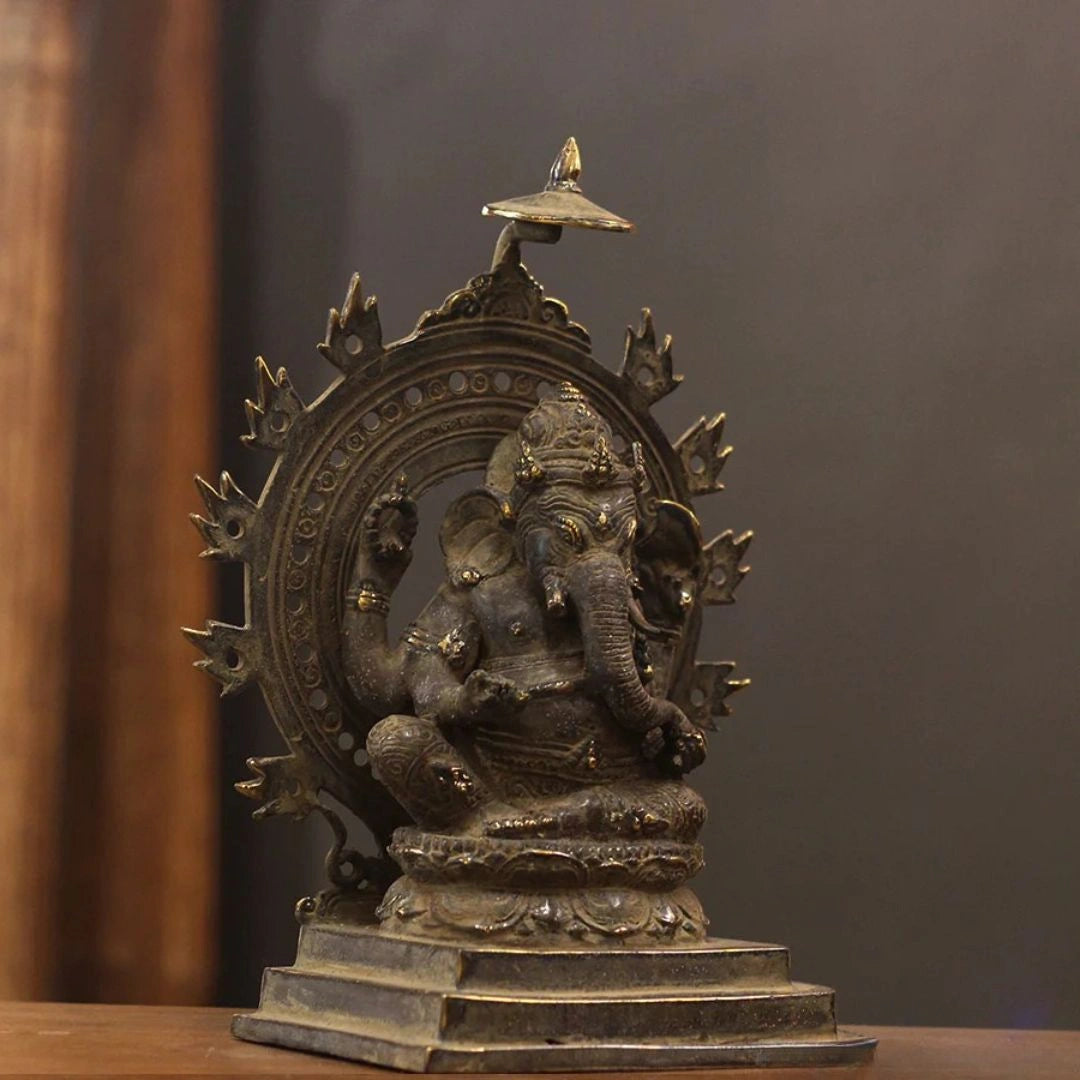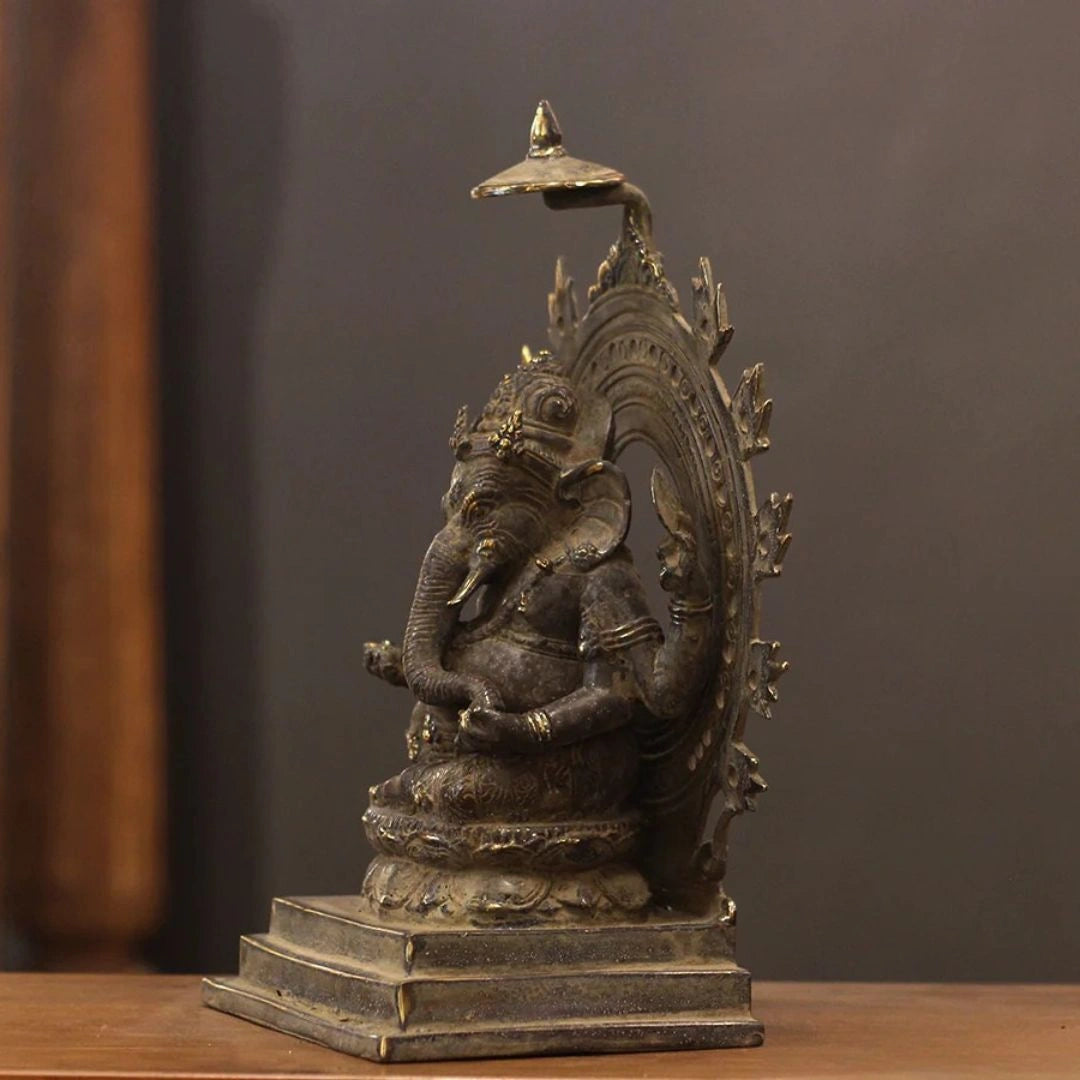 This elegant solid brass statue portrays Lord Ganesha seated gracefully on a finely crafted chowki. His relaxed posture and serene expression capture his divine essence as the remover of obstacles and the bestower of wisdom, prosperity, and success. The detailed chowki base enhances the statue’s visual appeal and spiritual significance, making it a perfect addition to home temples, meditation areas, or as a statement décor piece. This artwork seamlessly blends devotion with traditional Indian craftsmanship, filling the space with positivity and auspicious energy.