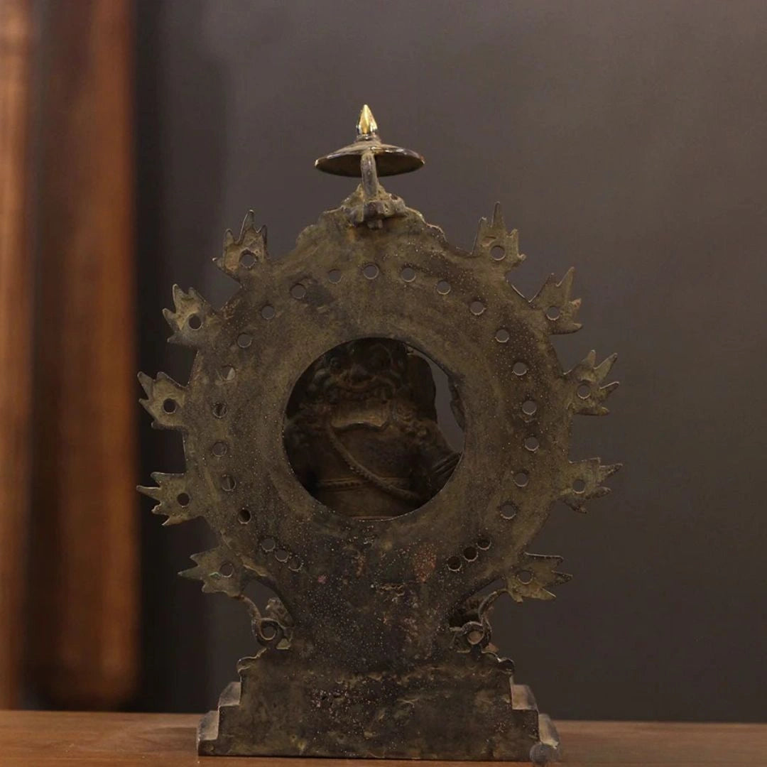 To preserve the beauty and spiritual aura of this sculpture, gently clean it with a soft, dry cloth. Avoid harsh chemicals or metal cleaners. For added protection and luster, you may occasionally apply a thin layer of natural oil using a soft cloth.