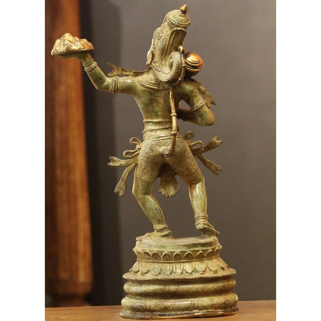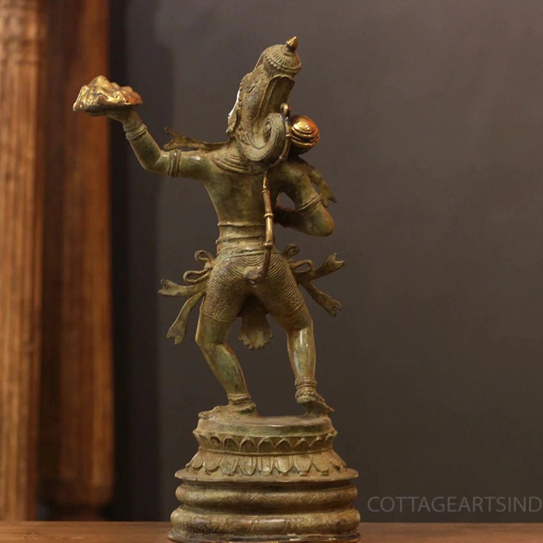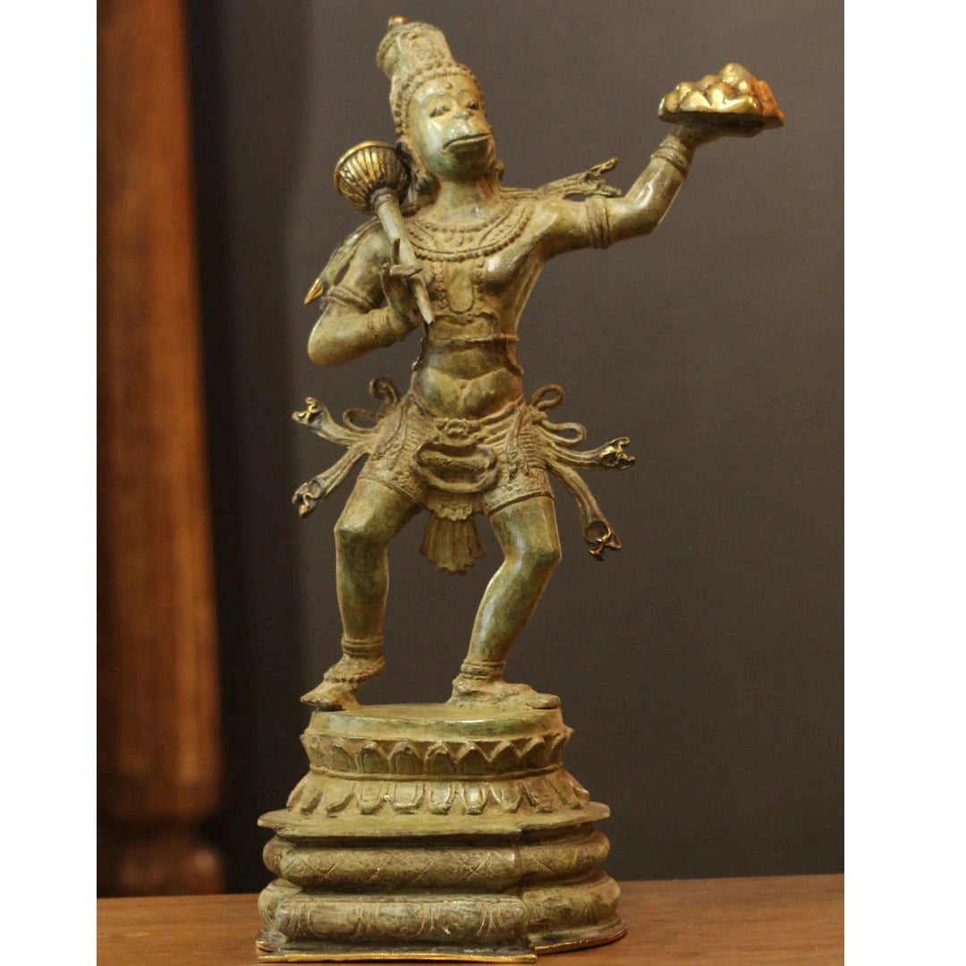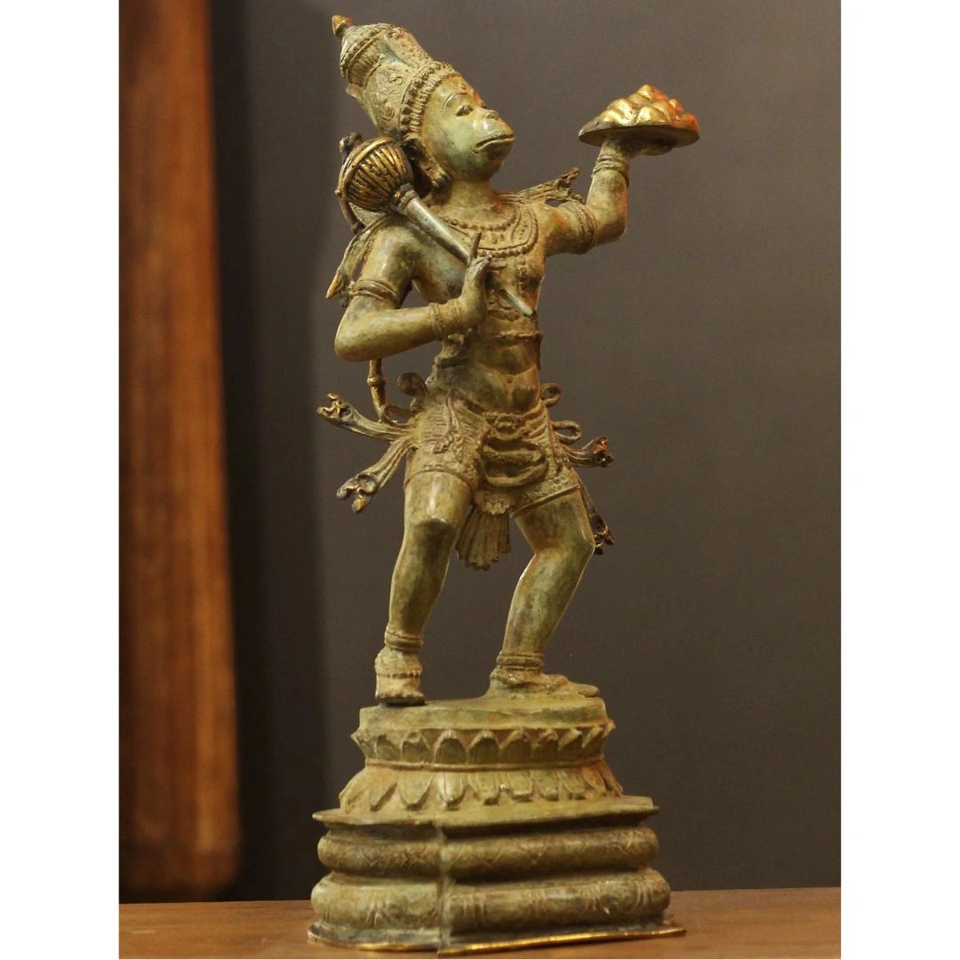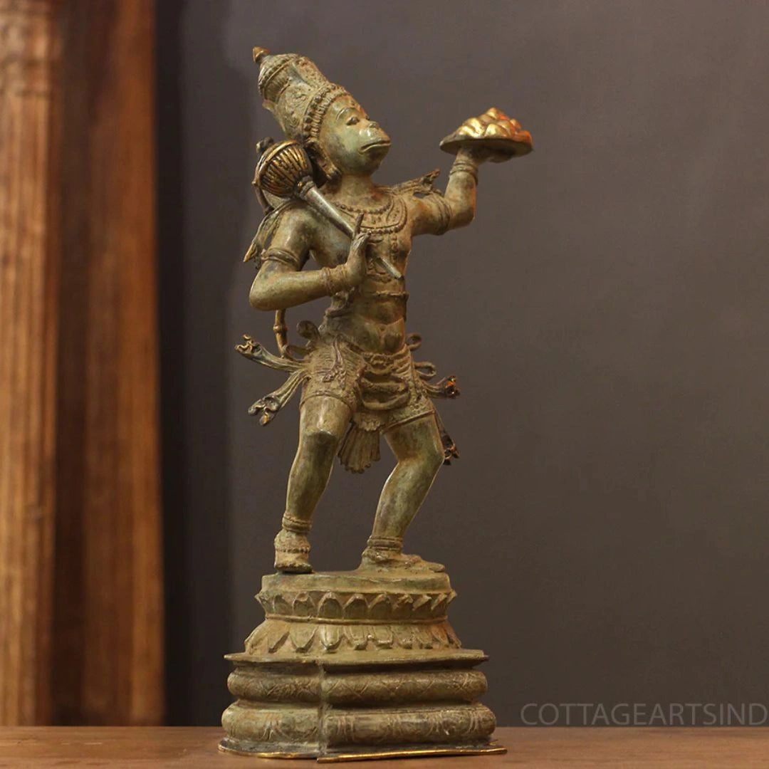This captivating bronze sculpture from Indonesia beautifully depicts Lord Hanuman, the beloved monkey god revered for his boundless devotion, strength, and courage. Shown in a poised and powerful stance, Hanuman carries the Sanjeevani Parvat—the mountain of healing herbs—in one hand and his sacred mace (Gada) in the other, symbolizing his divine service to Lord Rama and his role as a restorer of life and hope.