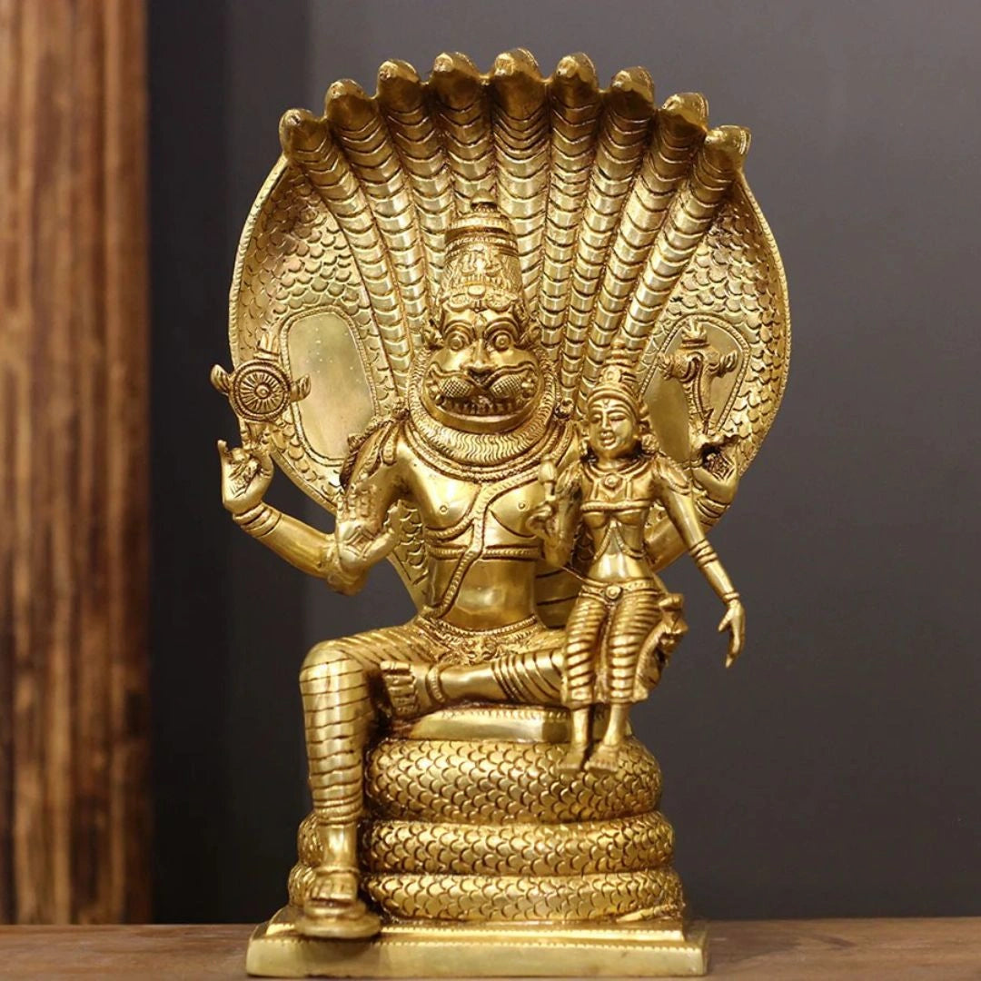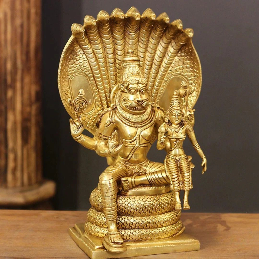 This beautifully handcrafted brass idol portrays Lord Narasimha, the powerful and protective incarnation of Lord Vishnu, with Goddess Lakshmi seated gracefully on his lap. The sculpture captures Narasimha’s commanding presence balanced with a calm, reassuring expression, symbolizing divine strength guided by compassion. Goddess Lakshmi, the embodiment of wealth and prosperity, adds an aura of grace and abundance to the piece.
