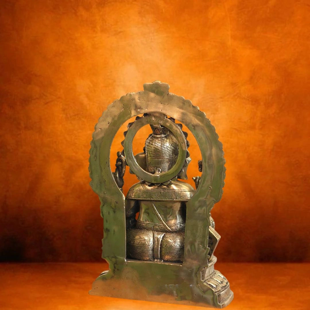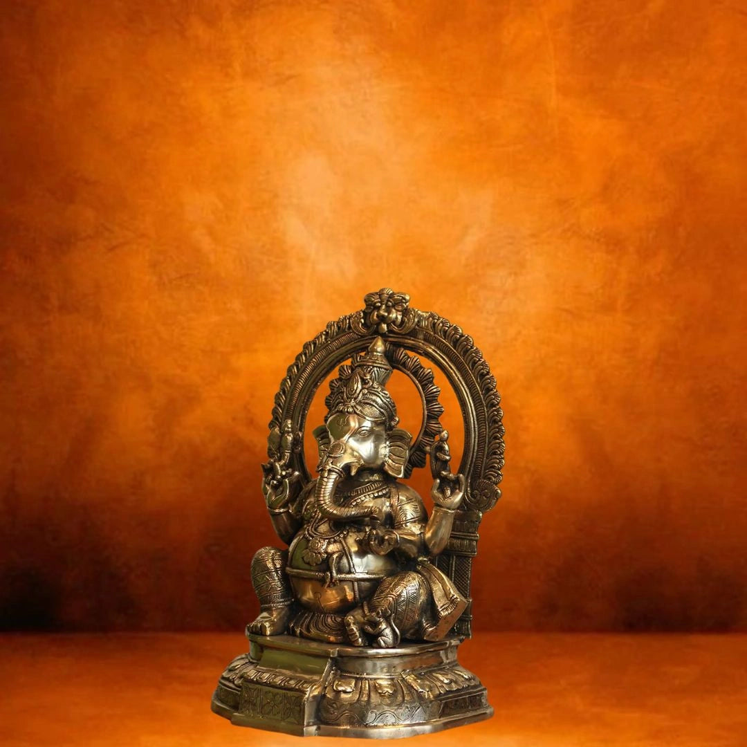 This beautifully crafted solid brass statue of Lord Ganesha depicts him seated peacefully on a lotus-shaped chowki, with both feet gently resting upon it. Behind him stands an elegant prabhawali (decorative arch) that enhances the divine presence of the idol.