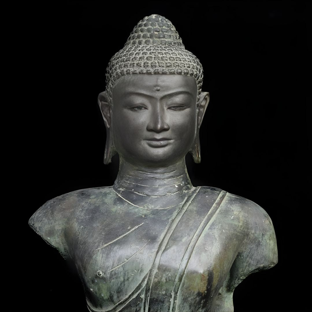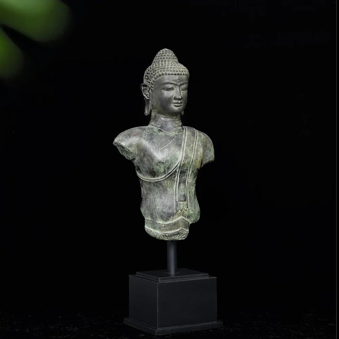 Bring home a sense of calm and timeless beauty with this bronze Buddha torso, finished in a rich antique patina and gracefully placed on a wooden stand. Its serene presence and balanced form make it a striking yet peaceful addition to any interior, whether displayed in a living space, meditation corner, or art collection.