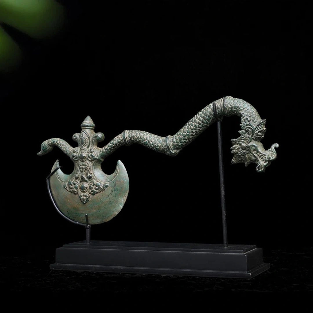 Bring home the timeless charm of this traditional Balinese decorative axe, a striking art piece inspired by ceremonial and ritual heritage. Crafted with intricate detailing, the axe features a beautiful antique green patina that highlights its age-old character. The handle is sculpted in the form of a dragon’s body, with the dragon’s head at the base, adding a bold and symbolic artistic touch. A captivating display piece for collectors, interior stylists, and lovers of ethnic art.