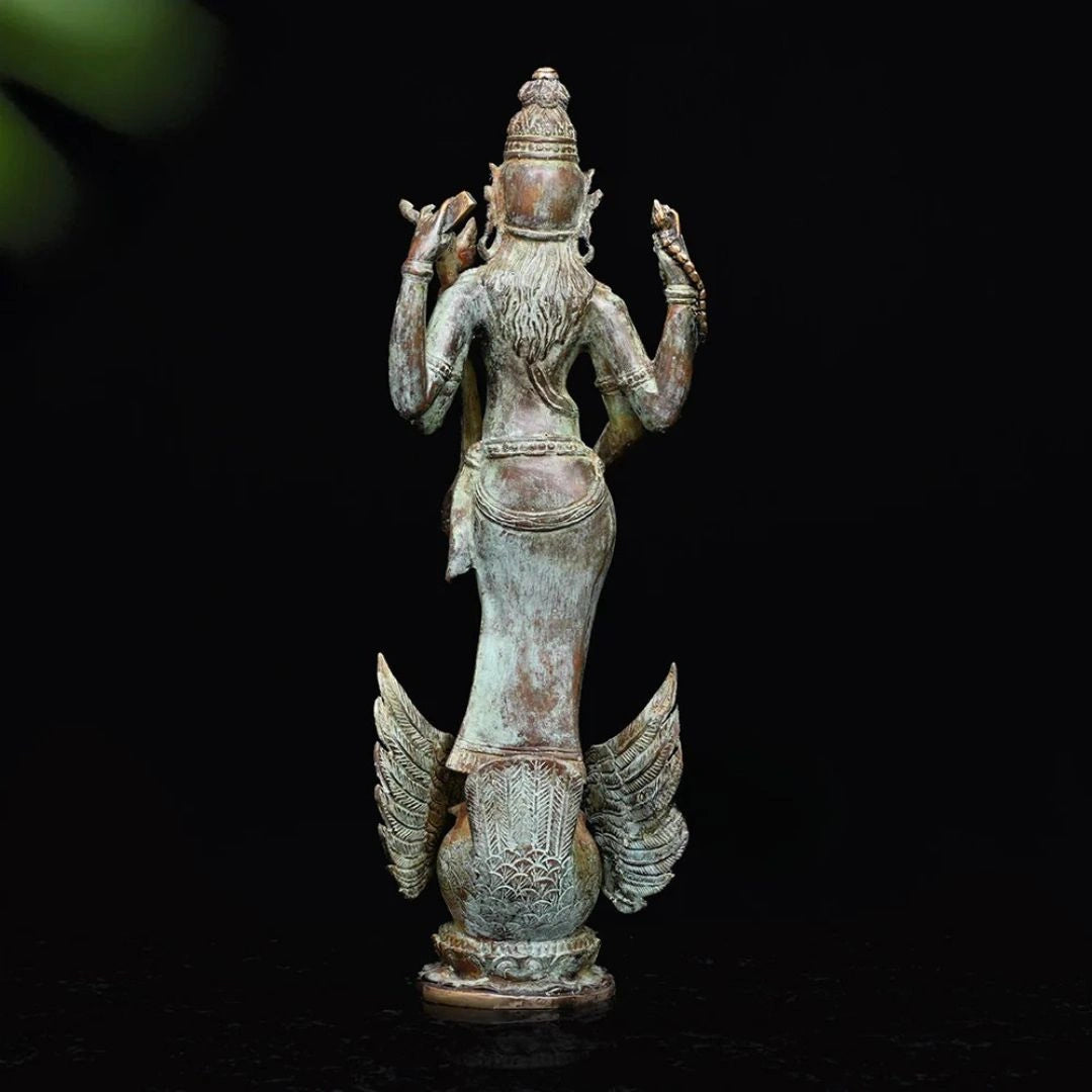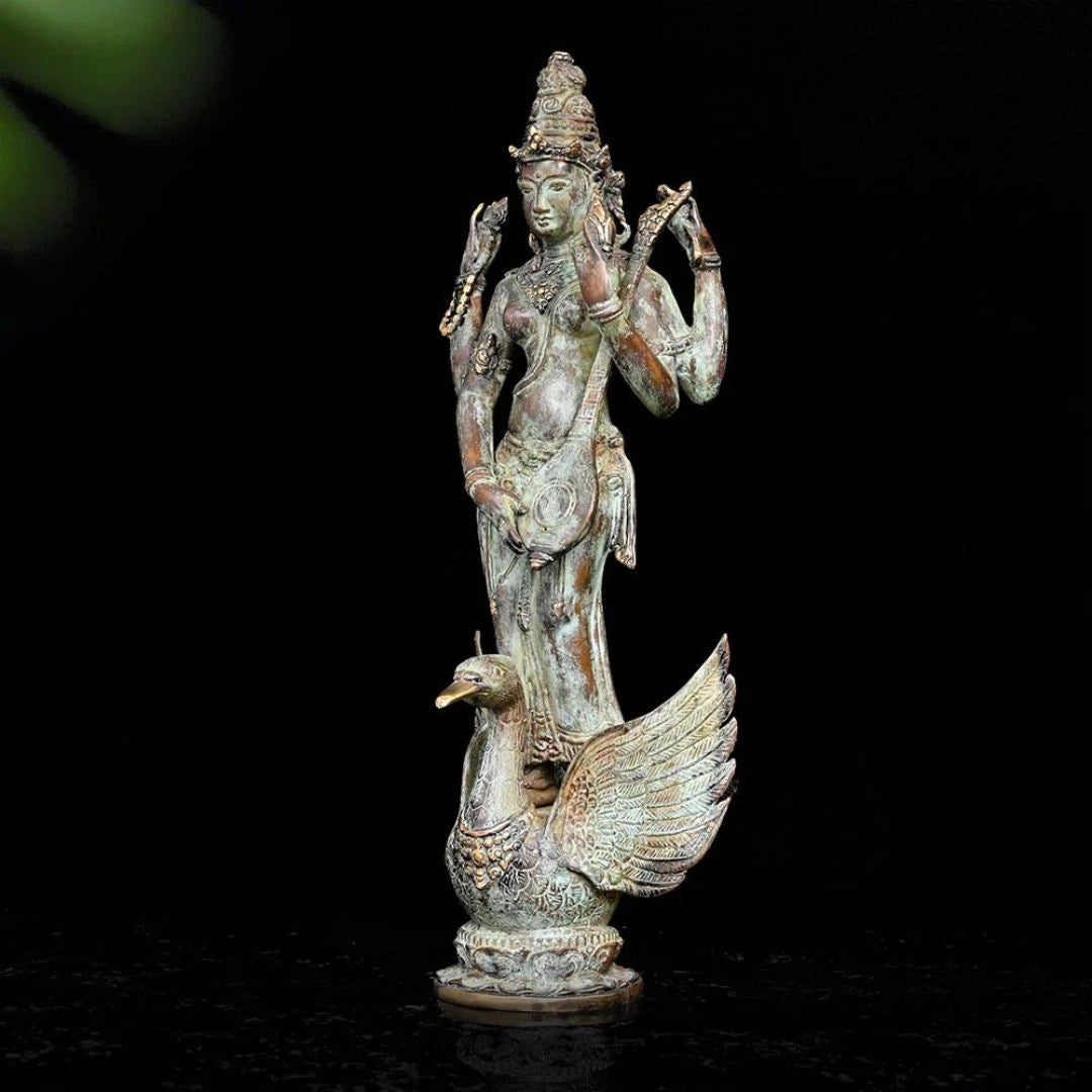 Welcome Maa Saraswati, the embodiment of knowledge, wisdom, and creativity, into your home with this beautifully handcrafted bronze sculpture. Skillfully made in Indonesia using high-quality bronze, the statue features a refined antique finish that enhances its divine charm and timeless appeal. Every piece reflects delicate detailing and artisanal skill, making it a graceful addition to your prayer space, study, or living area.