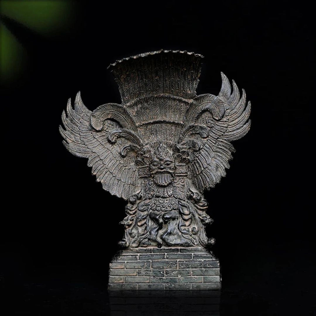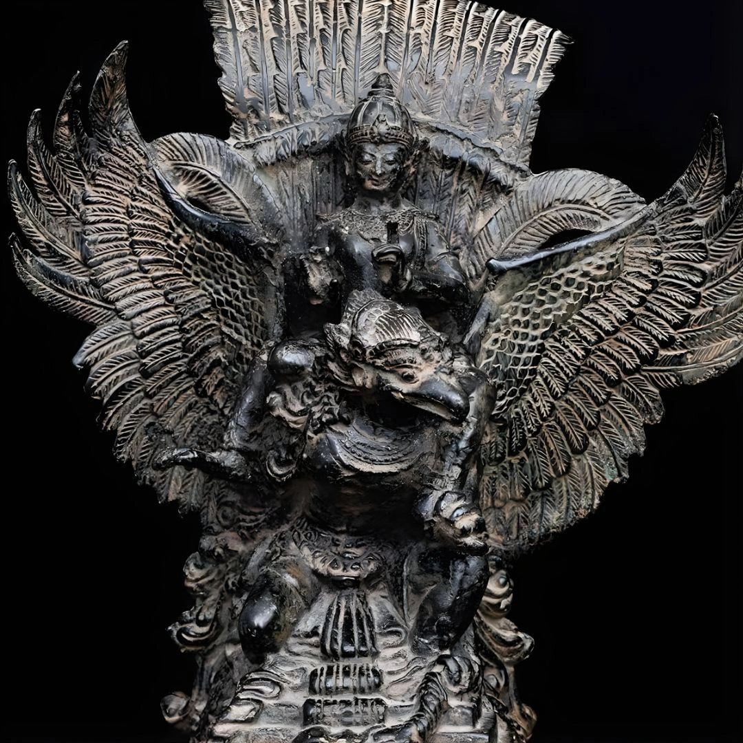 Bring home this magnificent Balinese bronze sculpture of Lord Vishnu, the Preserver, gracefully seated on the shoulders of his divine vahana, Garuda. The sculpture beautifully captures strength, balance, and divine protection, making it a striking spiritual and artistic statement. Finished with a rich antique patina, this handcrafted piece carries a timeless charm that blends tradition with elegance, enhancing both sacred and living spaces.