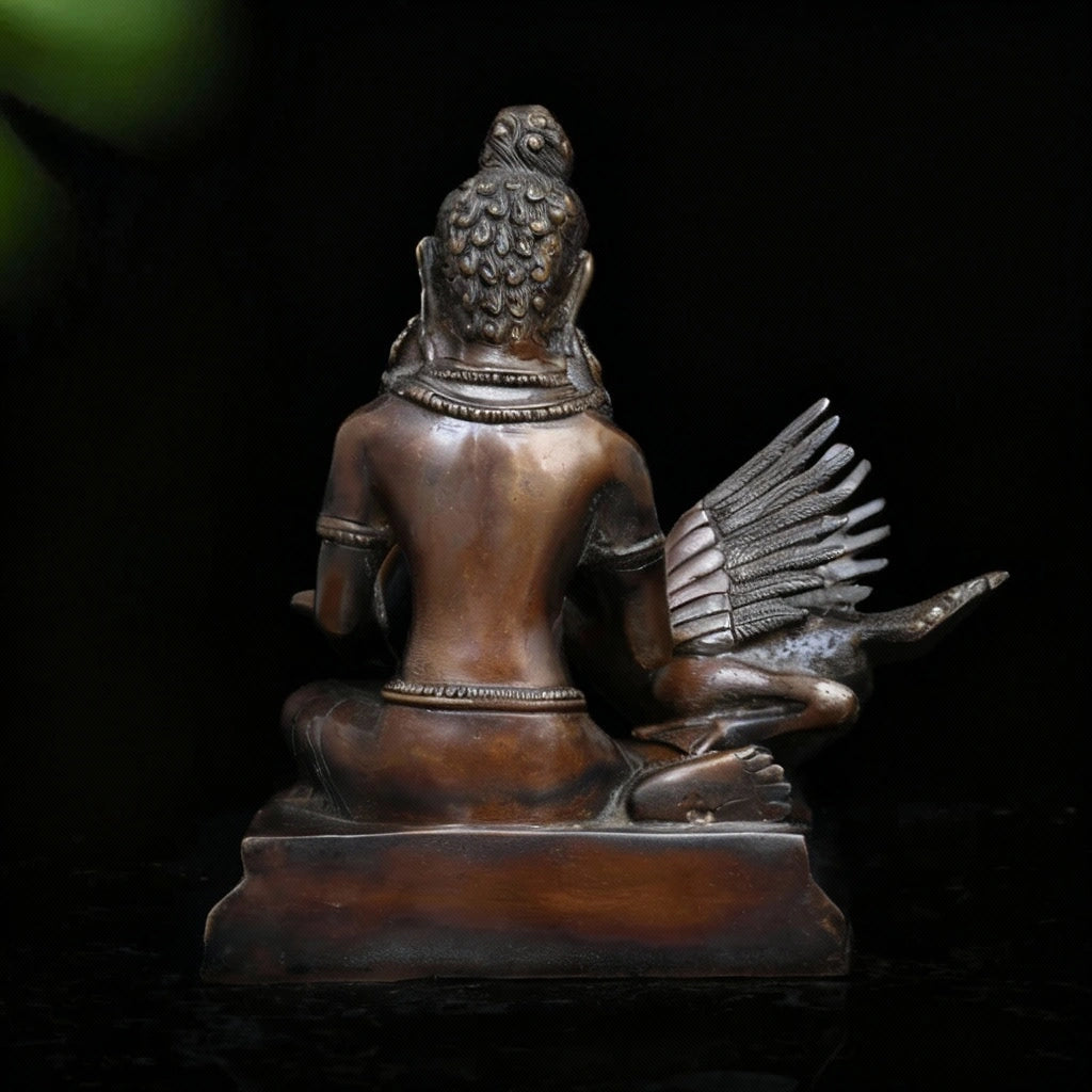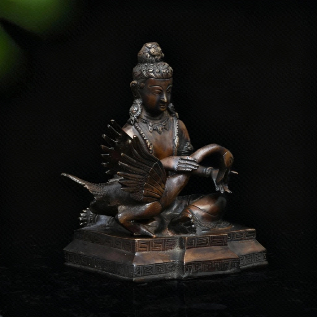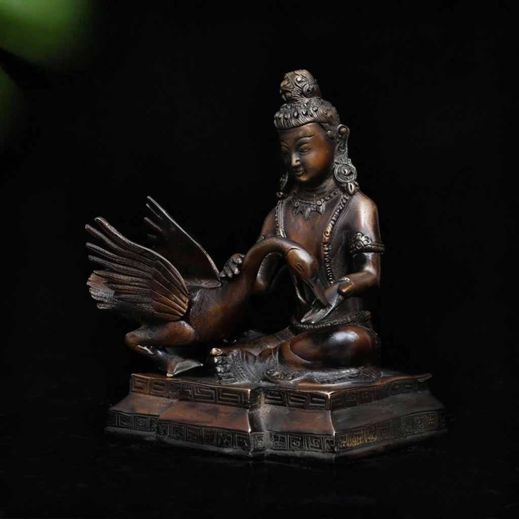 This brass artifact narrates a touching episode from the early life of Siddhartha. While playing with his cousin, a swan was struck by an arrow and fell helplessly to the ground. Siddhartha immediately ran to the injured bird, gently removed the arrow, and carefully nursed it back with compassion and care.