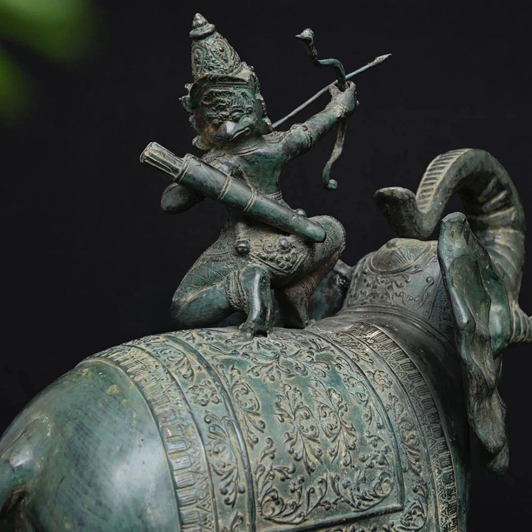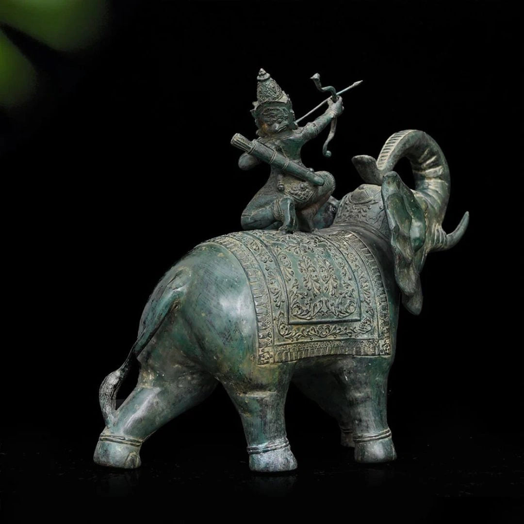 Bring home the powerful presence of Lord Indra, depicted in battle atop his divine elephant, Airavata. This striking bronze sculpture captures a moment of strength and determination, with Lord Indra holding his bow and arrow, ready to overcome evil. The antique finish adds a rich, timeworn character, giving the piece an old-world charm that draws the eye and elevates any space it is placed in. A true testament to skilled craftsmanship, this sculpture stands as a symbol of courage, authority, and divine protection.