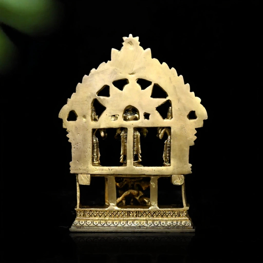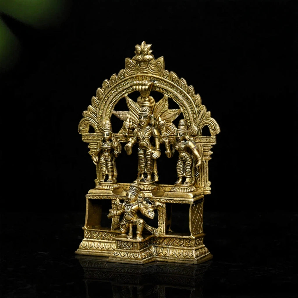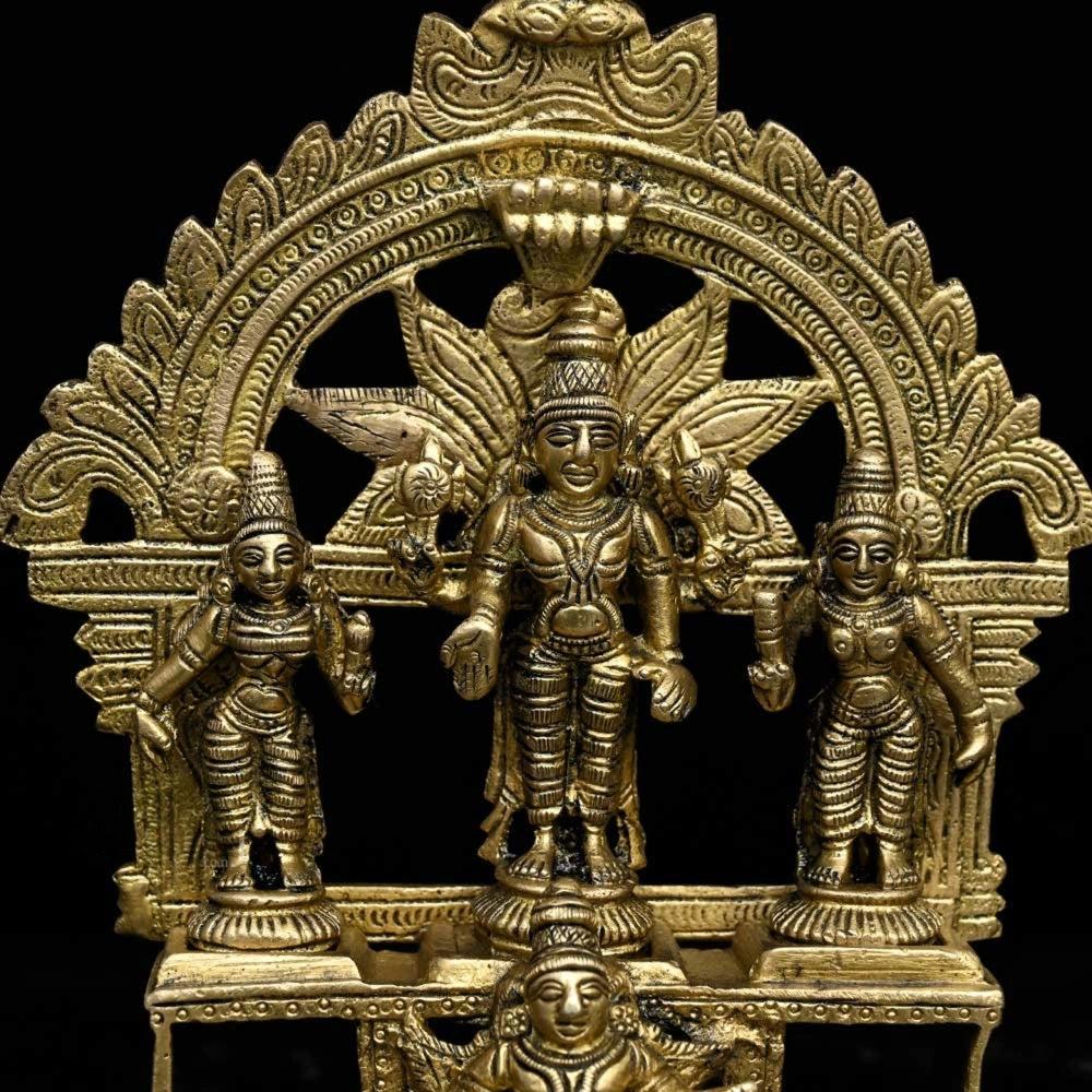 Package Includes: 1 Brass idol of Lord Vishnu with Lakshmi and Bhudevi on a Garuda pedestal