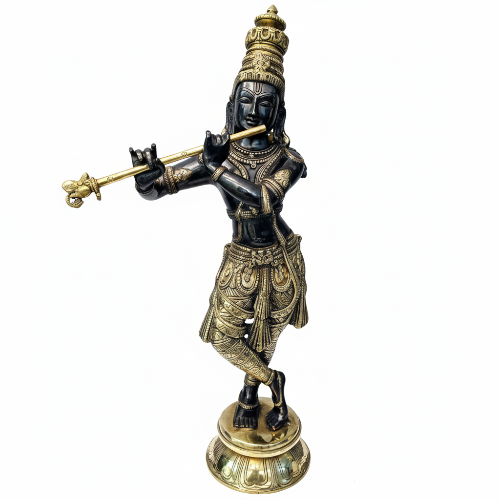 Decorate your home or office space with this stunning, premium brass sculpture of Lord Krishna, beautifully detailed while playing his enchanting flute (Bansuri).