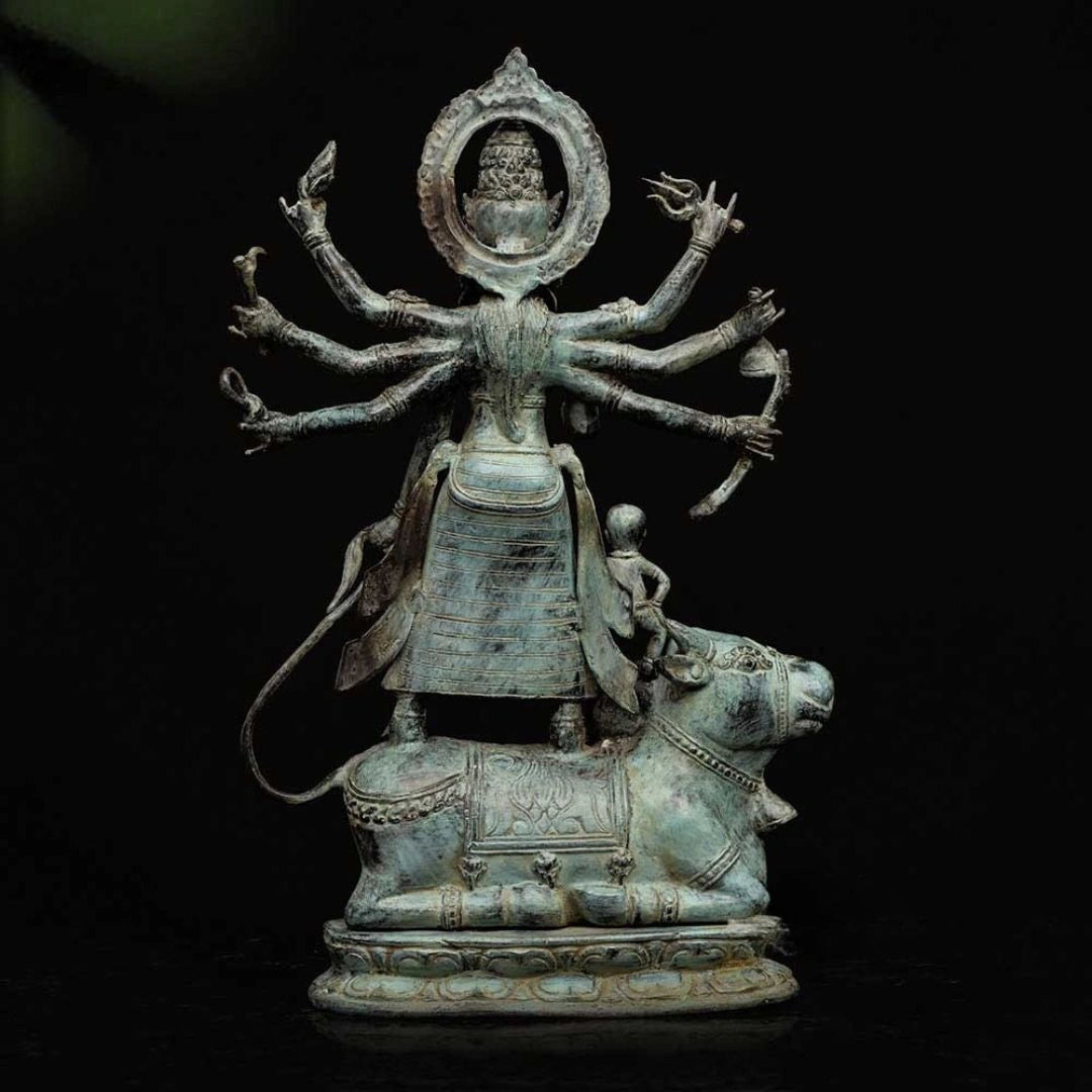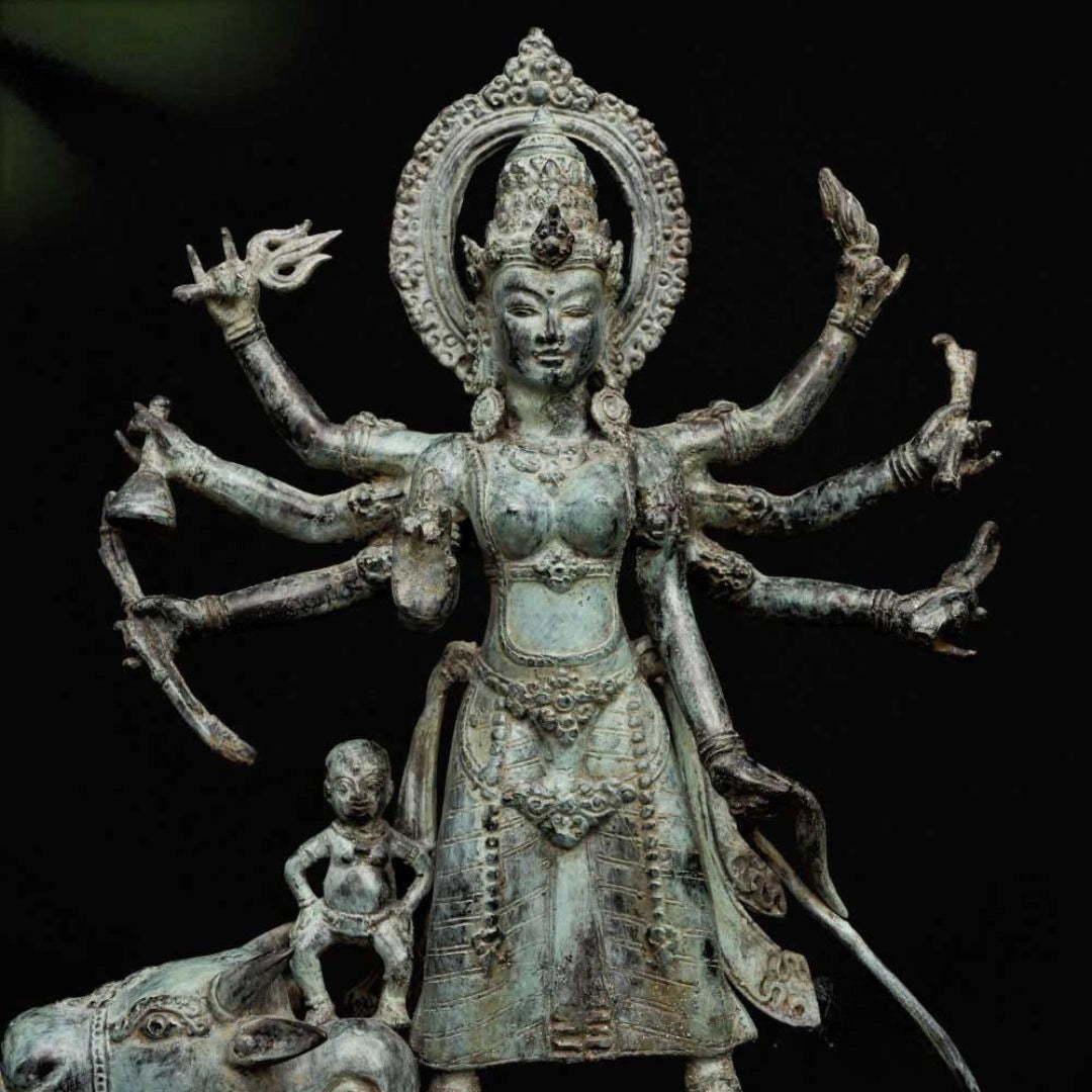 Own a magnificent representation of Goddess Durga standing victorious over the buffalo demon Mahishasura—a powerful symbol of divine strength and triumph when all other gods were unable to prevail. Shown with eight majestic arms, she firmly holds the buffalo’s tail while bearing sacred symbols including a bow, trident, flower, elephant goad, and arrow, with her right hand raised in vitarka mudra, the gesture of wisdom and teaching. Accented with a rare antique patina featuring a subtle blue hue, this Balinese bronze sculpture is a striking and collectible work of sacred art.