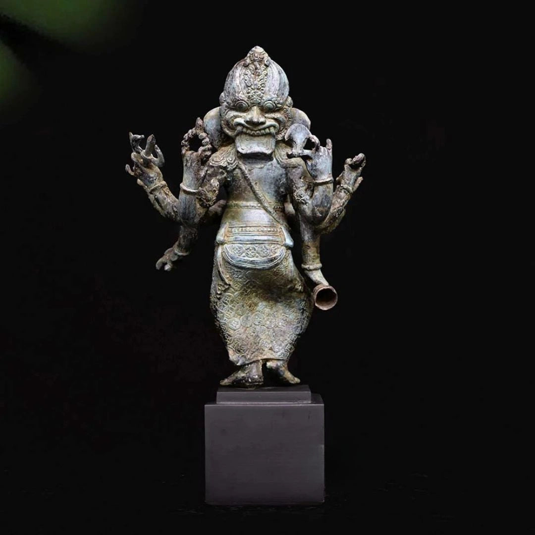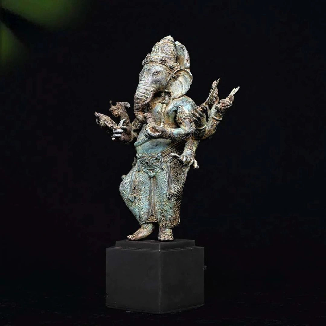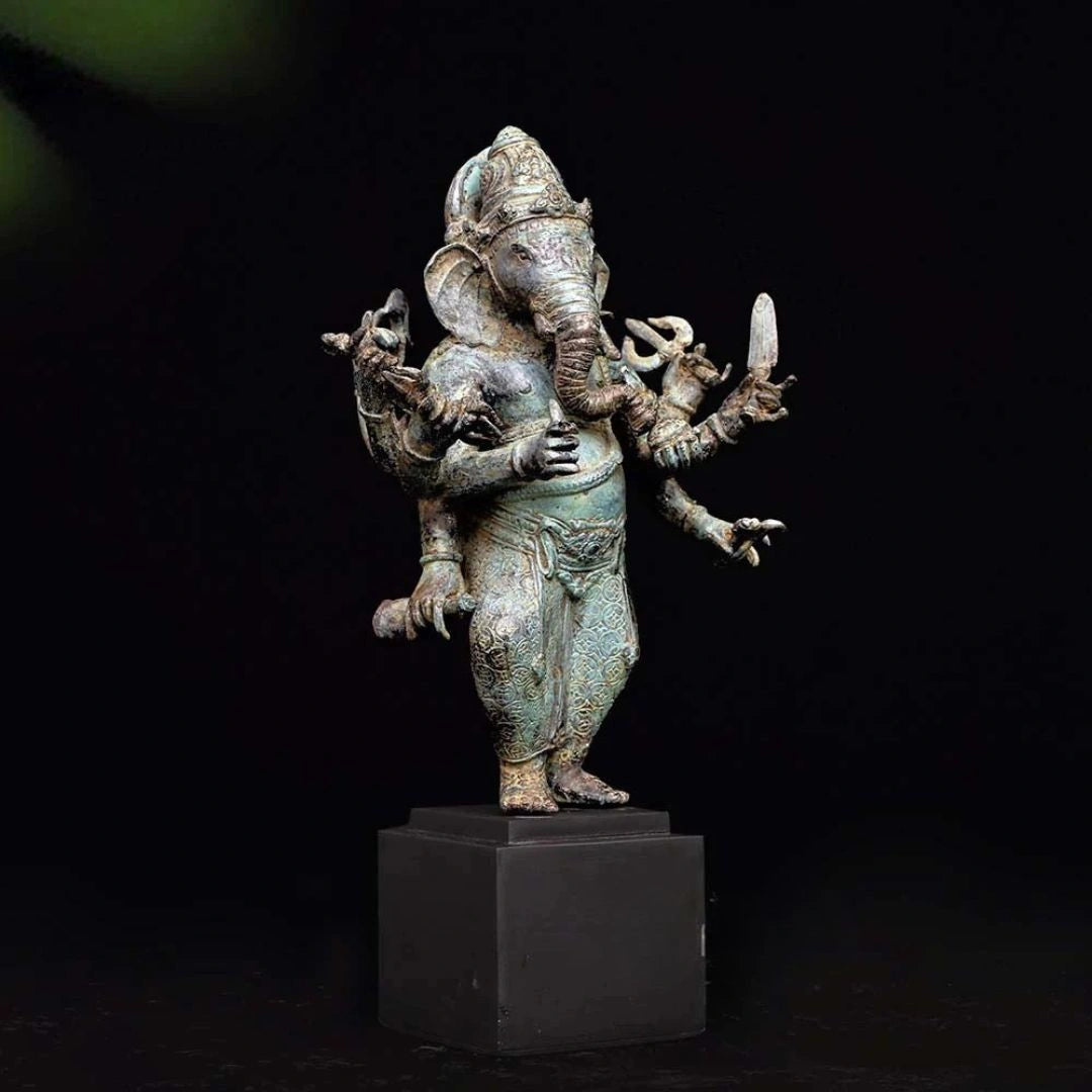 Bring home this majestic standing Lord Ganesha sculpture, exquisitely handcrafted in Indonesian bronze and finished with a rich antique patina. Depicted in a rare ten-armed form holding divine weapons, this sculpture embodies protection, wisdom, and the removal of obstacles. A striking blend of spiritual symbolism and fine artistry, it is an exceptional addition for devotees of Lord Ganesha and discerning art collectors alike.